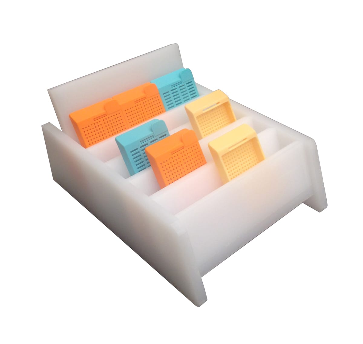 Histology cassette organizer holds 15 tissue / biopsy cassettes. Durable, heavy duty construction. Slanted design keeps cassettes upright for easy access. Also holds slides.