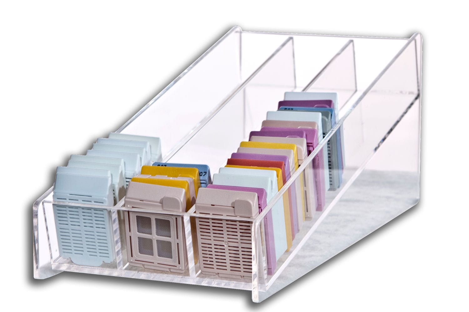Histology cassette organizer, slanted with 3-slots, holds approximately 85 blocks. Constructed from durable 1/8 inch clear acrylic. 4.5 in (W) x 9.5 (D) x 3.5 (H)