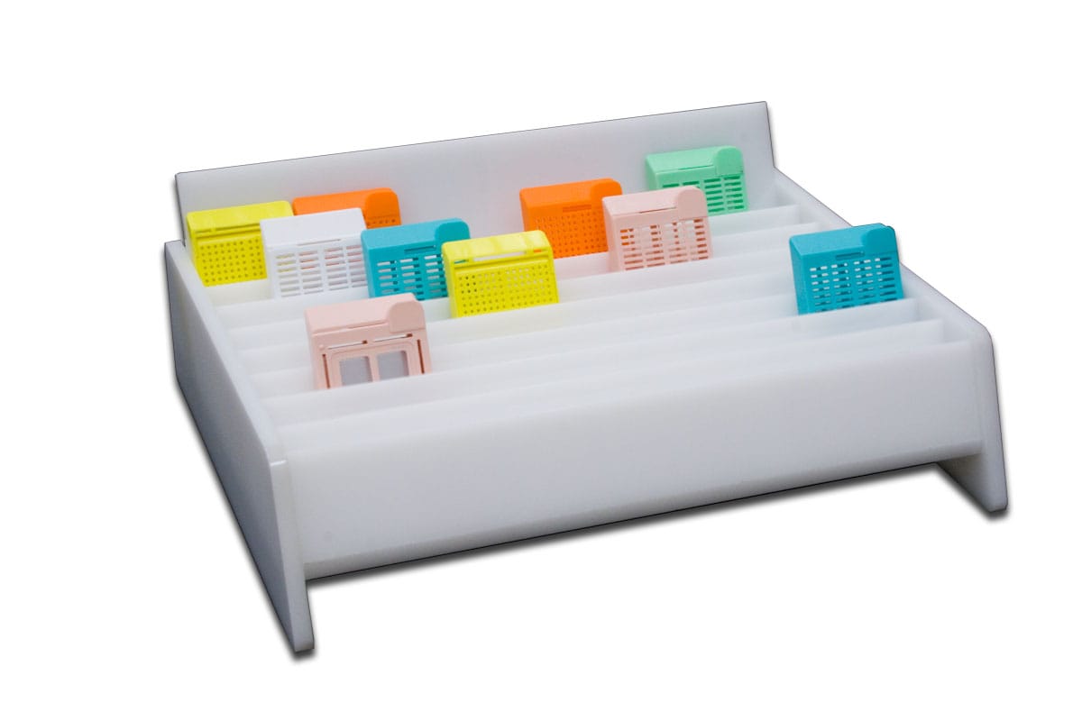 Histology cassette organizer holds 48 tissue / biopsy cassettes. Durable, heavy duty construction. Slanted design keeps cassettes upright for easy access. Also holds slides. 7 in (W) x 5.5 (D) x 2.5 (H)