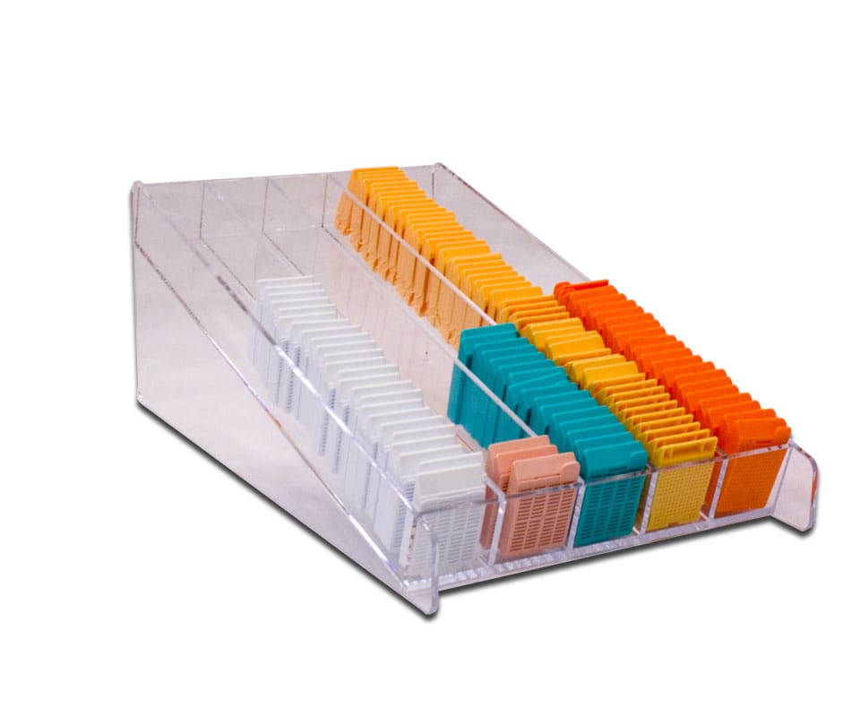 Histology cassette organizer, slanted with 5-slots, holds approximately 150 blocks. Constructed from durable 1/8 inch clear acrylic. 7.5 in (W) x 12.5 (D) x 4 (H)